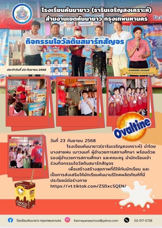 โรงเรียนคันนายาว(ธารินเจริญสงเคราะห์) นำโดยนางสายฝน เนาวนนท์ ผู้อำนวยการสถานศึกษา พร้อมด้วยรองผู้อำนวยการสถานศึกษา และคณะครู นำนักเรียนเข้าร่วมกิจกรรมโอวัลตินสมาร์ทสัญจร