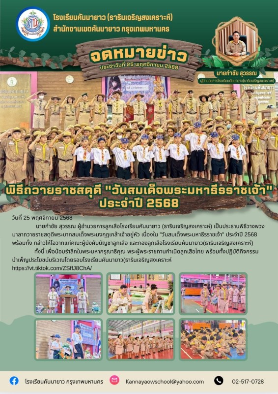 นายกำชัย สุวรรณ ผู้อำนวยการลูกเสือโรงเรียนคันนายาว (ธารินเจริญสงเคราะห์) เป็นประธานพิธีวางพวงมาลาถวายราชสดุดีพระบาทสมเด็จพระมงกุฎเกล้าเจ้าอยู่หัว เนื่องใน "วันสมเด็จพระมหาธีรราชเจ้า" ประจำปี 2568 พร้อมทั้ง กล่าวให้โอวาทแก่คณะผู้บังคับบัญชาลูกเสือ และกองลูกเสือโรงเรียนคันนายาว(ธารินเจริญสงเคราะห์)