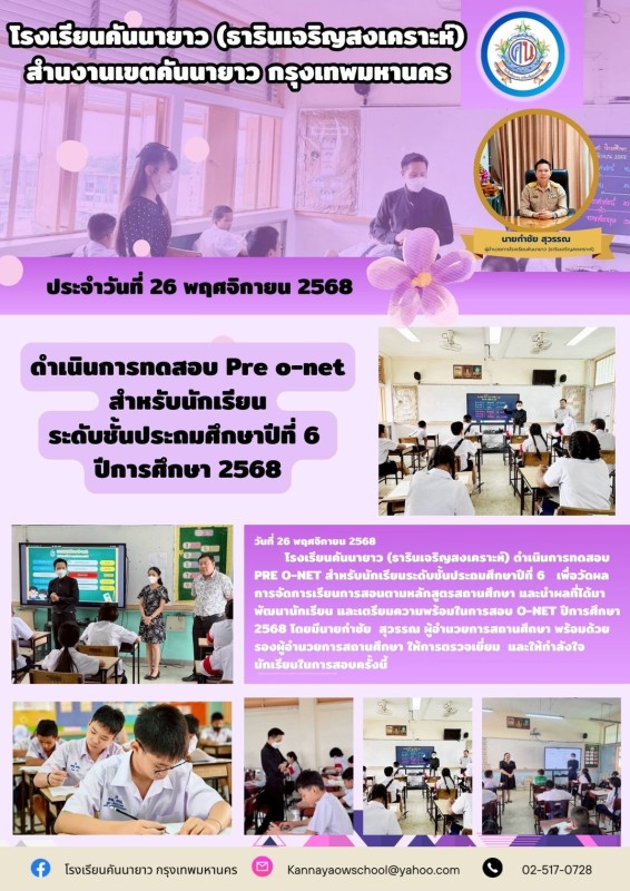 โรงเรียนคันนายาว (ธารินเจริญสงเคราะห์) ดำเนินการทดสอบ Pre o-net สำหรับนักเรียนระดับชั้นประถมศึกษาปีที่ 6 เพื่อวัดผลการจัดการเรียนการสอนตามหลักสูตรสถานศึกษา และนำผลที่ได้มาพัฒนานักเรียน และเตรียมความพร้อมในการสอบ o-net ปีการศึกษา 2568 โดยมีนายกำชัย สุวรรณ ผู้อำนวยการสถานศึกษา พร้อมด้วยรองผู้อำนวยการสถานศึกษา ให้การตรวจเยี่ยม และให้กำลังใจนักเรียนในการสอบครั้งนี้