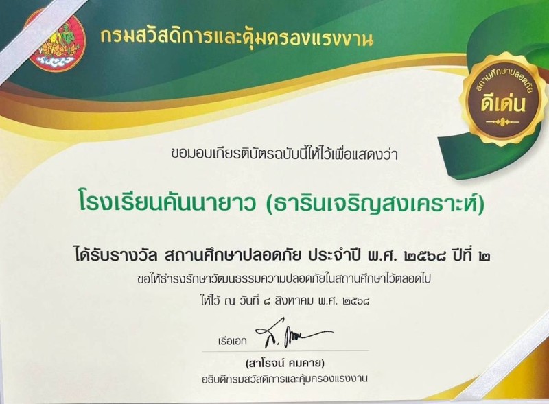 รางวัล "สถานศึกษาปลอดภัย" ระดับดีเด่น ประจำปี พ.ศ. 2568 (ปีที่ 2 ติดต่อกัน)