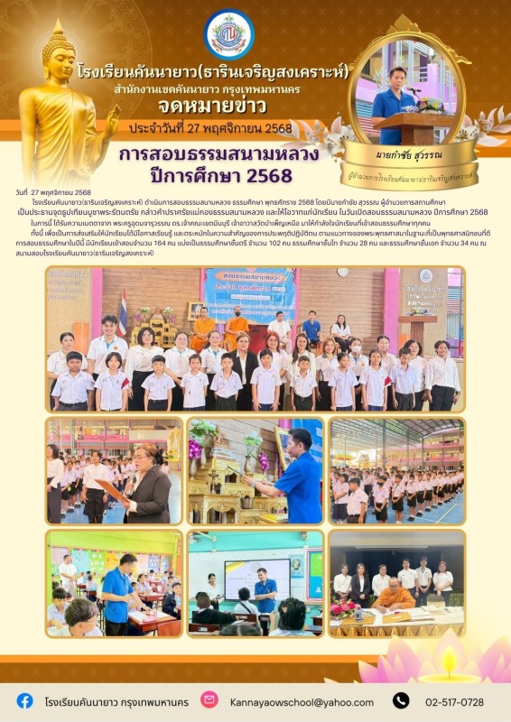 โรงเรียนคันนายาว(ธารินเจริญสงเคราะห์) ดำเนินการสอบธรรมสนามหลวง ธรรมศึกษา พุทธศักราช 2568 โดยมีนายกำชัย สุวรรณ ผู้อำนวยการสถานศึกษา เป็นประธานจุดธูปเทียนบูชาพระรัตนตรัย กล่าวคำปราศรัยแม่กองธรรมสนามหลวง และให้โอวาทแก่นักเรียน ในวันเปิดสอบธรรมสนามหลวง ปีการศึกษา 2568