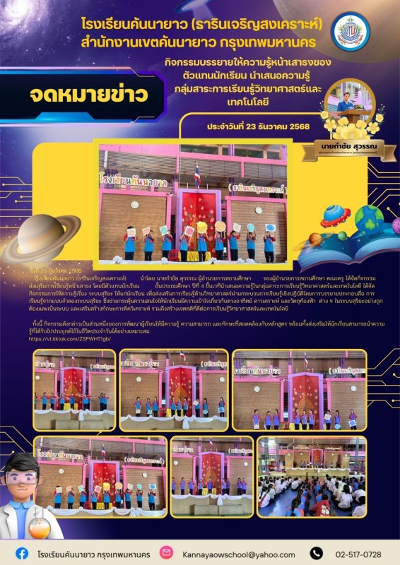 โรงเรียนคันนายาว (ธารินเจริญสงเคราะห์) นำโดย นายกำชัย สุวรรณ ผู้อำนวยการสถานศึกษา รองผู้อำนวยการสถานศึกษา คณะครู ได้จัดกิจกรรม ส่งเสริมการเรียนรู้หน้าเสาธง โดยมีตัวแทนนักเรียน ชั้นประถมศึกษา ปีที่ 4 ขึ้นเวทีนำเสนอความรู้ในกลุ่มสาระการเรียนรู้วิทยาศาสตร์และเทคโนโลยี ได้จัดกิจกรรมการให้ความรู้เรื่อง ระบบสุริยะ ให้แก่นักเรียน เพื่อส่งเสริมการเรียนรู้ด้านวิทยาศาสตร์ผ่านกระบวนการเรียนรู้เชิงปฏิบัติโดยการบรรยายประกอบสื่อ การเรียนรู้จากแบบจำลองระบบสุริยะ ซึ่งช่วยกระตุ้นความสนใจให้นักเรียนมีความเข้าใจเกี่ยวกับดวงอาทิตย์ ดาวเคราะห์ และวัตถุท้องฟ้า ต่าง ๆ ในระบบสุริยะอย่างถูกต้องและเป็นระบบ และเสริมสร้างทักษะการคิดวิเคราะห์ รวมถึงสร้างเจตคติที่ดีต่อการเรียนรู้วิทยาศาสตร์และเทคโนโลยี