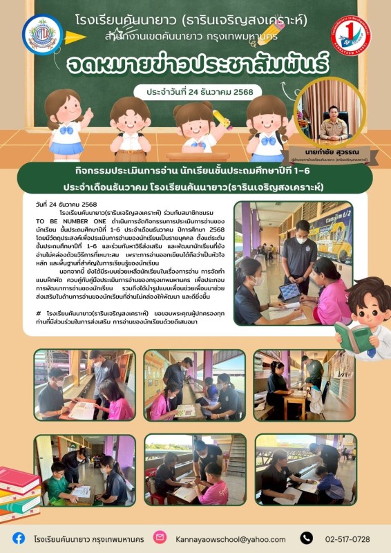 โรงเรียนคันนายาว(ธารินเจริญสงเคราะห์) ร่วมกับสมาชิกชมรม TO BE NUMBER ONE ดำเนินการจัดกิจกรรมการประเมินการอ่านของนักเรียน ชั้นประถมศึกษาปีที่ 1-6 ประจำเดือนธันวาคม ปีการศึกษา 2568 โดยมีวัตถุประสงค์เพื่อประเมินการอ่านของนักเรียนเป็นรายบุคคล ตั้งแต่ระดับชั้นประถมศึกษาปีที่ 1-6 และร่วมกันหาวิธีส่งเสริม และพัฒนานักเรียนที่ยังอ่านไม่คล่องด้วยวิธีการที่เหมาะสม เพราะการอ่านออกเขียนได้ถือว่าเป็นหัวใจหลัก และพื้นฐานที่สำคัญในการเรียนรู้ของนักเรียน