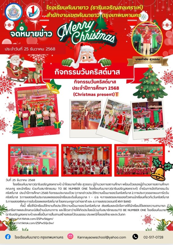 โรงเรียนคันนายาว(ธารินเจริญสงเคราะห์) นำโดยนายกำชัย สุวรรณ ผู้อำนวยการสถานศึกษา พร้อมด้วยรองผู้อำนวยการสถานศึกษา คณะครู และนักเรียน ร่วมกับสมาชิกชมรม TO BE NUMBER ONE โรงเรียนคันนายาว(ธารินเจริญสงเคราะห์) ดำเนินการจัดกิจกรรมวันคริสต์มาส ประจำปีการศึกษา 2568 กิจกรรมประกอบด้วย 1.การกล่าวประวัติความเป็นมาของวันคริสต์มาส 2.การประกวดออกแบบการ์ดวันคริสต์มาส 3.การแสดงเต้นประกอบเพลงของนักเรียนระดับชั้นอนุบาล 1 - ป.6 4.การแสดงละครของตัวแทนนักเรียนเกี่ยวกับวันคริสต์มาส 5.การแสดงพิเศษ การขับร้องเพลงคริสต์มาส โดยคณะครูชาวต่างชาติ และ 6.การแสดงวงดนตรี KNY BAND