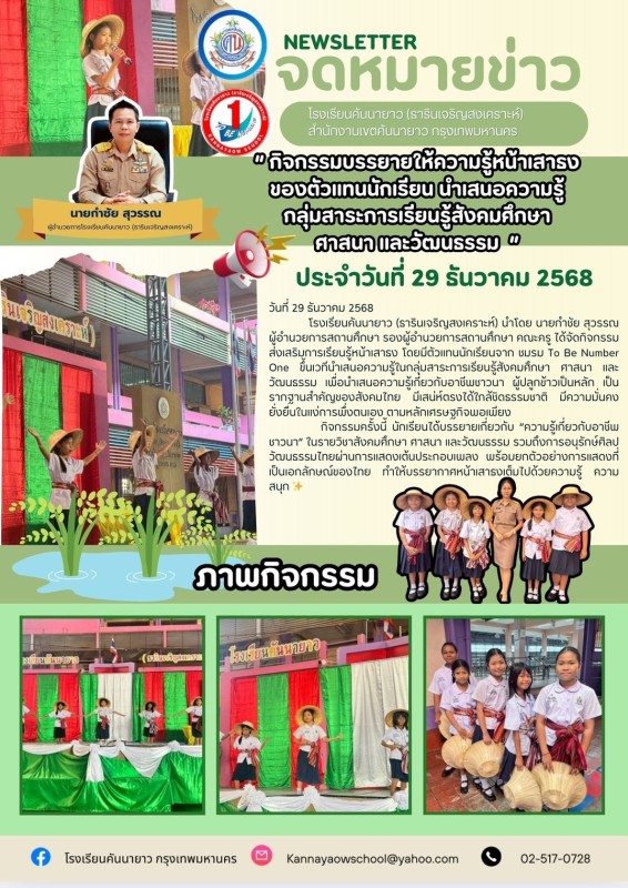 โรงเรียนคันนายาว (ธารินเจริญสงเคราะห์) นำโดย นายกำชัย สุวรรณ ผู้อำนวยการสถานศึกษา รองผู้อำนวยการสถานศึกษา คณะครู ได้จัดกิจกรรมส่งเสริมการเรียนรู้หน้าเสาธง โดยมีตัวแทนนักเรียนจาก ชมรม To Be Number One ขึ้นเวทีนำเสนอความรู้ในกลุ่มสาระการเรียนรู้สังคมศึกษา ศาสนา และวัฒนธรรม เพื่อนำเสนอความรู้เกี่ยวกับอาชีพชาวนา ผู้ปลูกข้าวเป็นหลัก เป็นรากฐานสำคัญของสังคมไทย มีเสน่ห์ตรงได้ใกล้ชิดธรรมชาติ มีความมั่นคงยั่งยืนในแง่การพึ่งตนเอง ตามหลักเศรษฐกิจพอเพียง