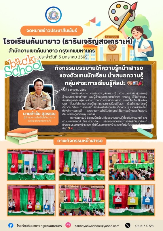 โรงเรียนคันนายาว (ธารินเจริญสงเคราะห์) นำโดย นายกำชัย สุวรรณ ผู้อำนวยการสถานศึกษา รองผู้อำนวยการสถานศึกษา คณะครู ได้จัดกิจกรรมส่งเสริมการเรียนรู้หน้าเสาธง โดยมีตัวแทนนักเรียนจาก ชมรม To Be Number One ขึ้นเวทีนำเสนอความรู้ในกลุ่มสาระการเรียนรู้ศิลปะ เพื่อนำเสนอความรู้เกี่ยวกับ “เรื่อง การผสมสี” เพื่อส่งเสริมให้นักเรียนเกิดความรู้ ความเข้าใจเกี่ยวกับหลักการผสมสี ตลอดจนการนำสีไปประยุกต์ใช้ในการสร้างสรรค์ผลงานศิลปะอย่างถูกต้องและเหมาะสม