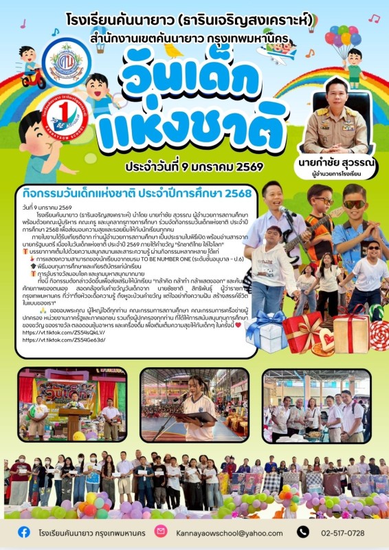 โรงเรียนคันนายาว (ธารินเจริญสงเคราะห์) นำโดย นายกำชัย สุวรรณ ผู้อำนวยการสถานศึกษา พร้อมด้วยคณะผู้บริหาร คณะครู และบุคลากรทางการศึกษา ร่วมจัดกิจกรรมวันเด็กแห่งชาติ ประจำปีการศึกษา 2568 เพื่อส่งมอบความสุขและรอยยิ้มให้กับนักเรียนทุกคน