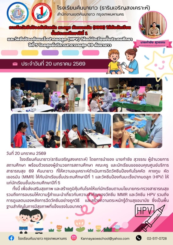>> การฉีดวัคซีนป้องกันโรคหัด คางทูม หัดเยอรมัน (MMR) ให้กับนักเรียนชั้นประถมศึกษาปีที่ 1 และวัคซีนป้องกันมะเร็งปากมดลูก (HPV) ให้แก่นักเรียนชั้นประถมศึกษาปีที่ 5 โดยศูนย์บริการสาธารณสุข 69 คันนายาว