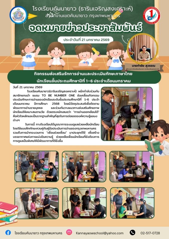 โรงเรียนคันนายาว(ธารินเจริญสงเคราะห์) ผนึกกำลังร่วมกับสมาชิกแกนนำ ชมรม TO BE NUMBER ONE ขับเคลื่อนกิจกรรมประเมินทักษะการอ่านของนักเรียนระดับชั้นประถมศึกษาปีที่ 1-6 ประจำเดือนมกราคม ปีการศึกษา 2568 โดยมีวัตถุประสงค์เพื่อติดตามพัฒนาการอ่านรายบุคคล และร่วมกันวางแนวทางส่งเสริมศักยภาพนักเรียนให้เหมาะสมตามวัย ด้วยตระหนักเสมอว่า "การอ่านออกเขียนได้" คือหัวใจหลักและเป็นรากฐานสำคัญที่สุดในการต่อยอดองค์ความรู้แขนงต่างๆ