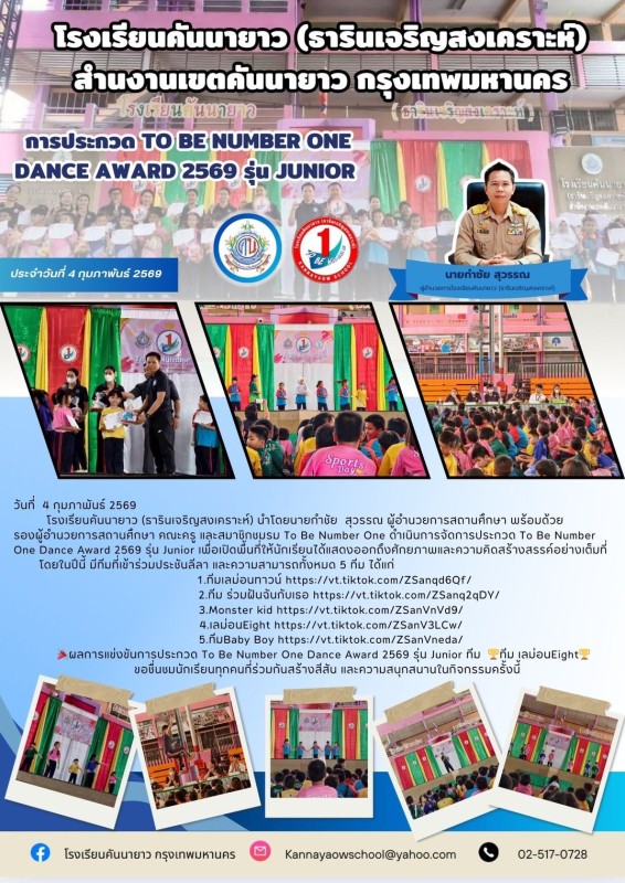 โรงเรียนคันนายาว (ธารินเจริญสงเคราะห์) นำโดยนายกำชัย สุวรรณ ผู้อำนวยการสถานศึกษา พร้อมด้วยรองผู้อำนวยการสถานศึกษา คณะครู และสมาชิกชมรม To Be Number One ดำเนินการจัดการประกวด To Be Number One Dance Award 2569 รุ่น Junior เพื่อเปิดพื้นที่ให้นักเรียนได้แสดงออกถึงศักยภาพและความคิดสร้างสรรค์อย่างเต็มที่