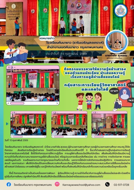 โรงเรียนคันนายาว (ธารินเจริญสงเคราะห์) นำโดย นายกำชัย สุวรรณ ผู้อำนวยการสถานศึกษา รองผู้อำนวยการสถานศึกษา คณะครู ได้จัดกิจกรรม ส่งเสริมการเรียนรู้หน้าเสาธง โดยมีตัวแทนนักเรียนชั้นประถมศึกษาปีที่ 6 ขึ้นเวทีนำเสนอความรู้ในกลุ่มสาระการเรียนรู้วิทยาศาสตร์และเทคโนโลยี ซึ่งได้จัดกิจกรรมการให้ความรู้เรื่อง การบลูลี่ผ่านสื่อออนไลน์ให้แก่นักเรียน เพื่อส่งเสริมให้นักเรียนมีความรู้ ความเข้าใจเกี่ยวกับความหมายของการบูลลี่ผ่านสื่อออนไลน์ หรือรูปแบบการกลั่นแกล้งที่พบบ่อย เช่น การด่าทอ การตัดต่อภาพ การเผยแพร่ข้อมูลส่วนตัว รวมถึงผลกระทบทางกฎหมายและโทษที่อาจเกิดขึ้น นอกจากนี้ยังมีการจัดกิจกรรมเชิงปฏิบัติการ การแสดงบทบาทสมมติ และการเสวนา เพื่อให้นักเรียนได้แลกเปลี่ยนความคิดเห็นและเรียนรู้วิธีป้องกันตนเองอย่างเหมาะสมรวมถึงการใช้สื่อออนไลน์อย่างสร้างสรรค์ มีจริยธรรม เคารพสิทธิผู้อื่น และรู้จักคิดก่อนโพสต์ พร้อมทั้งส่งเสริมให้นักเรียนกล้าที่จะขอความช่วยเหลือเมื่อถูกกลั่นแกล้ง