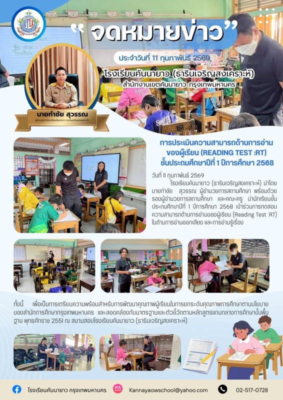 โรงเรียนคันนายาว (ธารินเจริญสงเคราะห์) นำโดยนายกำชัย สุวรรณ ผู้อำนวยการสถานศึกษา พร้อมด้วยรองผู้อำนวยการสถานศึกษา และคณะครู นำนักเรียนชั้นประถมศึกษาปีที่ 1 ปีการศึกษา 2568 เข้าร่วมการทดสอบความสามารถด้านการอ่านของผู้เรียน (Reading Test :RT) ในด้านการอ่านออกเสียง และการอ่านรู้เรื่อง