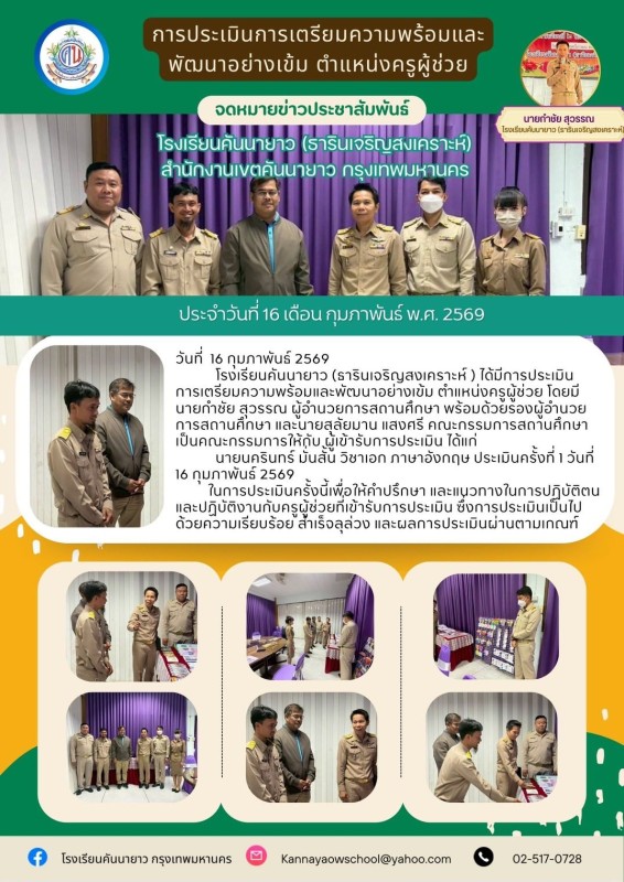 โรงเรียนคันนายาว (ธารินเจริญสงเคราะห์ ) ได้มีการประเมินการเตรียมความพร้อมและพัฒนาอย่างเข้ม ตำแหน่งครูผู้ช่วย โดยมีนายกำชัย สุวรรณ ผู้อำนวยการสถานศึกษา พร้อมด้วยรองผู้อำนวยการสถานศึกษา และนายสุลัยมาน แสงศรี คณะกรรมการสถานศึกษา เป็นคณะกรรมการให้กับ ผู้เข้ารับการประเมิน ได้แก่
