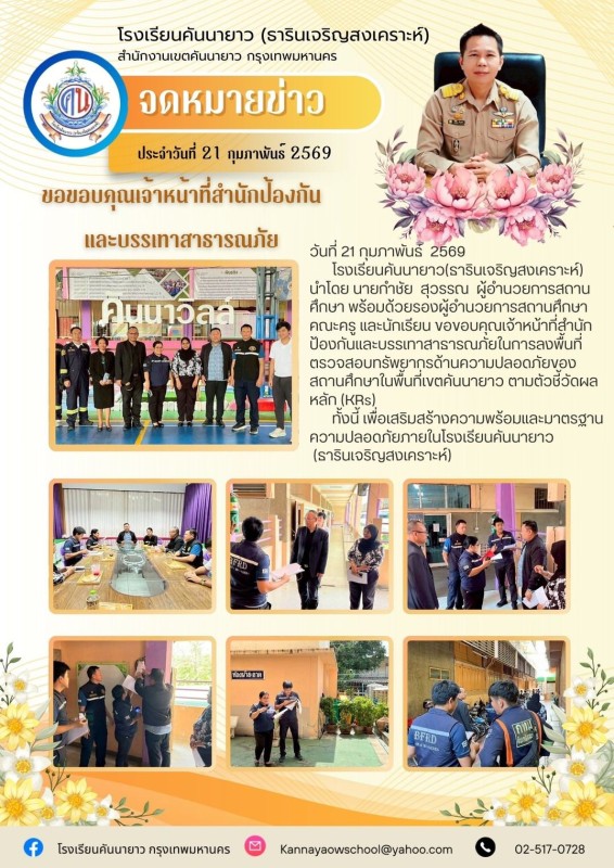 โรงเรียนคันนายาว(ธารินเจริญสงเคราะห์) นำโดย นายกำชัย สุวรรณ ผู้อำนวยการสถานศึกษา พร้อมด้วยรองผู้อำนวยการสถานศึกษา คณะครู และนักเรียน ขอขอบคุณเจ้าหน้าที่สำนักป้องกันและบรรเทาสาธารณภัยในการลงพื้นที่ตรวจสอบทรัพยากรด้านความปลอดภัยของสถานศึกษาในพื้นที่เขตคันนายาว ตามตัวชี้วัดผลหลัก (KRs)