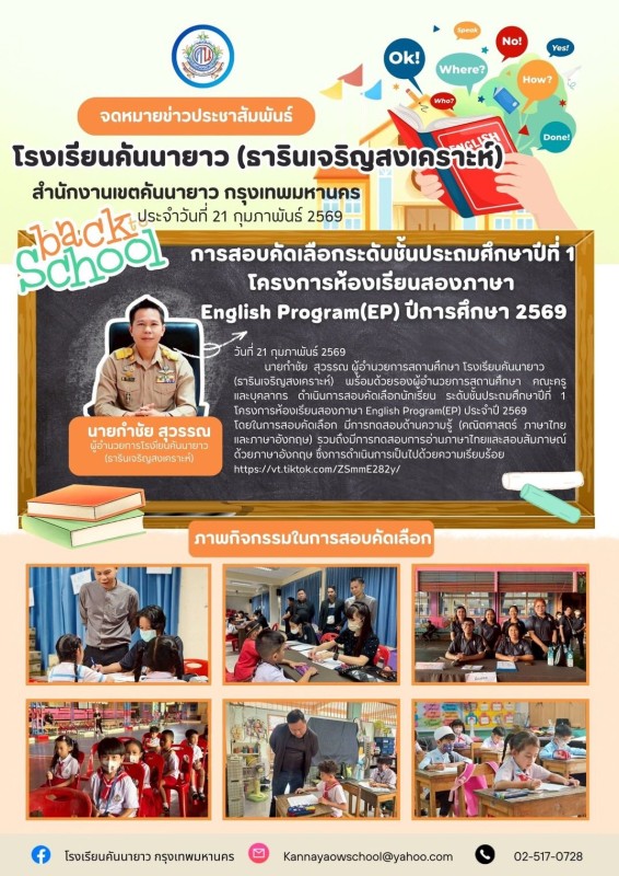 นายกำชัย สุวรรณ ผู้อำนวยการสถานศึกษา โรงเรียนคันนายาว(ธารินเจริญสงเคราะห์) พร้อมด้วยรองผู้อำนวยการสถานศึกษา คณะครู และบุคลากร ดำเนินการสอบคัดเลือกนักเรียน ระดับชั้นประถมศึกษาปีที่ 1 โครงการห้องเรียนสองภาษา English Program(EP) ประจำปี 2569 โดยในการสอบคัดเลือก มีการทดสอบด้านความรู้ (คณิตศาสตร์ ภาษาไทย และภาษาอังกฤษ) รวมถึงมีการทดสอบการอ่านภาษาไทย และสอบสัมภาษณ์ด้วยภาษาอังกฤษ ซึ่งการดำเนินการเป็นไปด้วยความเรียบร้อย