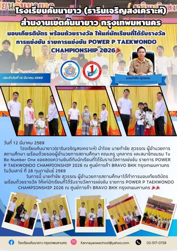 โรงเรียนคันนายาว(ธารินเจริญสงเคราะห์) นำโดย นายกำชัย สุวรรณ ผู้อำนวยการสถานศึกษา พร้อมด้วยรองผู้อำนวยการสถานศึกษา คณะครู บุคลากร และสมาชิกชมรม To Be Number One ขอแสดงความยินดีกับนักเรียนที่ได้รับรางวัลการแข่งขัน รายการ POWER P TAEKWONDO CHAMPIONSHIP 2026 ณ ศูนย์การค้า BRAVO BKK กรุงเทพมหานคร ในวันเสาร์ ที่ 28 กุมภาพันธ์ 2569