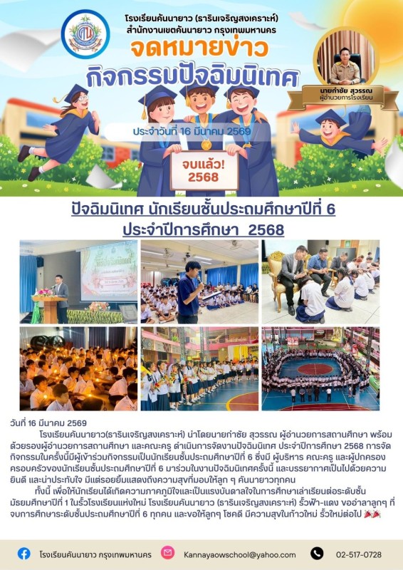 โรงเรียนคันนายาว(ธารินเจริญสงเคราะห์) นำโดยนายกำชัย สุวรรณ ผู้อำนวยการสถานศึกษา พร้อมด้วยรองผู้อำนวยการสถานศึกษา และคณะครู ดำเนินการจัดงานปัจฉิมนิเทศ ประจำปีการศึกษา 2568 การจัดกิจกรรมในครั้งนี้มีผู้เข้าร่วมกิจกรรมเป็นนักเรียนชั้นประถมศึกษาปีที่ 6 ซึ่งมี ผู้บริหาร คณะครู และผู้ปกครอง ครอบครัวของนักเรียนชั้นประถมศึกษาปีที่ 6 มาร่วมในงานปัจฉิมนิเทศครั้งนี้ และบรรยากาศเป็นไปด้วยความยินดี และน่าประทับใจ มีแต่รอยยิ้มแสดงถึงความสุขที่มอบให้ลูก ๆ คันนายาวทุกคน