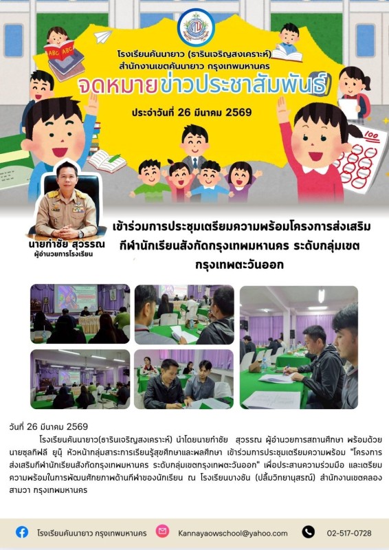 โรงเรียนคันนายาว(ธารินเจริญสงเคราะห์) นำโดยนายกำชัย สุวรรณ ผู้อำนวยการสถานศึกษา พร้อมด้วยนายซุลกิฟลี ยูนุ๊ หัวหน้ากลุ่มสาระการเรียนรู้สุขศึกษาและพลศึกษา เข้าร่วมการประชุมเตรียมความพร้อม "โครงการส่งเสริมกีฬานักเรียนสังกัดกรุงเทพมหานคร ระดับกลุ่มเขตกรุงเทพตะวันออก" เพื่อประสานความร่วมมือ และเตรียมความพร้อมในการพัฒนศักยภาพด้านกีฬาของนักเรียน ณ โรงเรียนบางชัน (ปลื้มวิทยานุสรณ์) สำนักงานเขตคลองสามวา กรุงเทพมหานคร