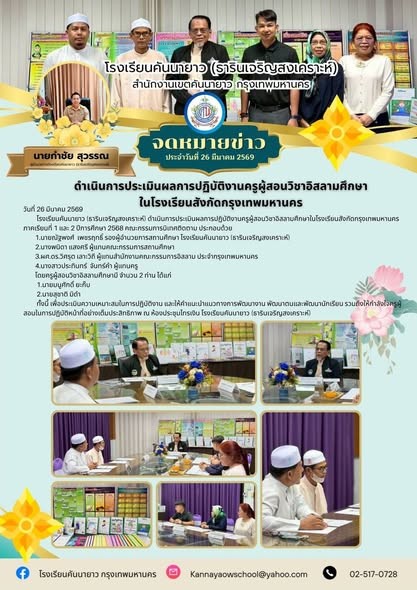 โรงเรียนคันนายาว (ธารินเจริญสงเคราะห์) ดำเนินการประเมินผลการปฏิบัติงานครูผู้สอนวิชาอิสลามศึกษาในโรงเรียนสังกัดกรุงเทพมหานคร ภาคเรียนที่ 1 และ 2 ปีการศึกษา 2568 คณะกรรมการนิเทศติดตาม ประกอบด้วย