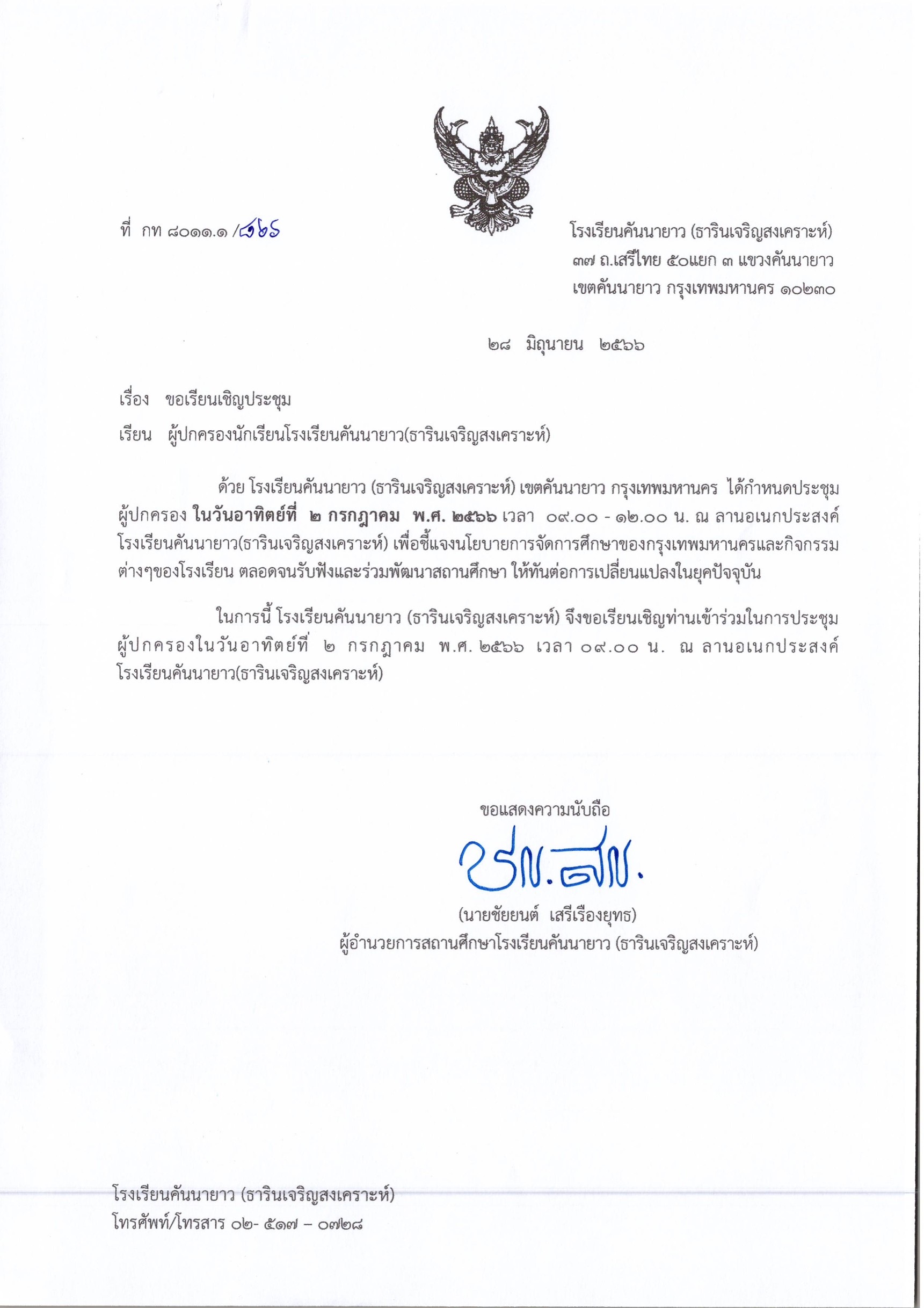 กำหนดการประชุมผู้ปกครอง โรงเรียนคันนายาว (ธารินเจริญสงเคราะห์)ภาคเรียนที่1 ปีการศึกษา 2566