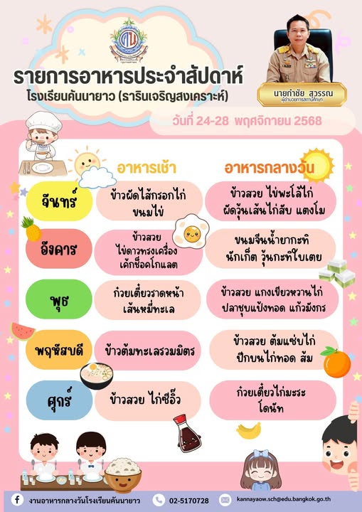 รายการอาหารกลางวัน โรงเรียนคันนายาว(ธารินเจริญสงเคราะห์) วันที่ 24-28 พฤศจิกายน 2568