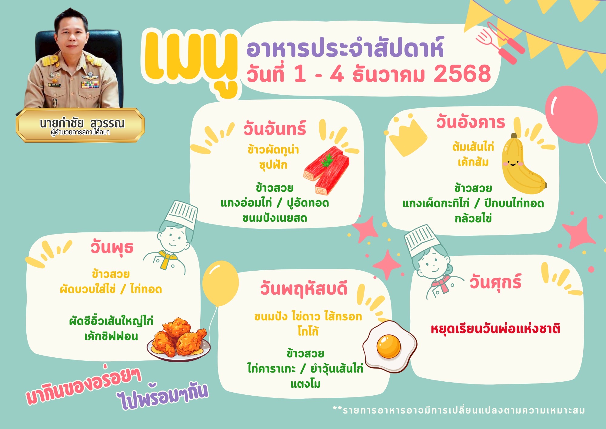 รายการอาหารกลางวัน โรงเรียนคันนายาว(ธารินเจริญสงเคราะห์) วันที่ 1-4 ธันวาคม 2568