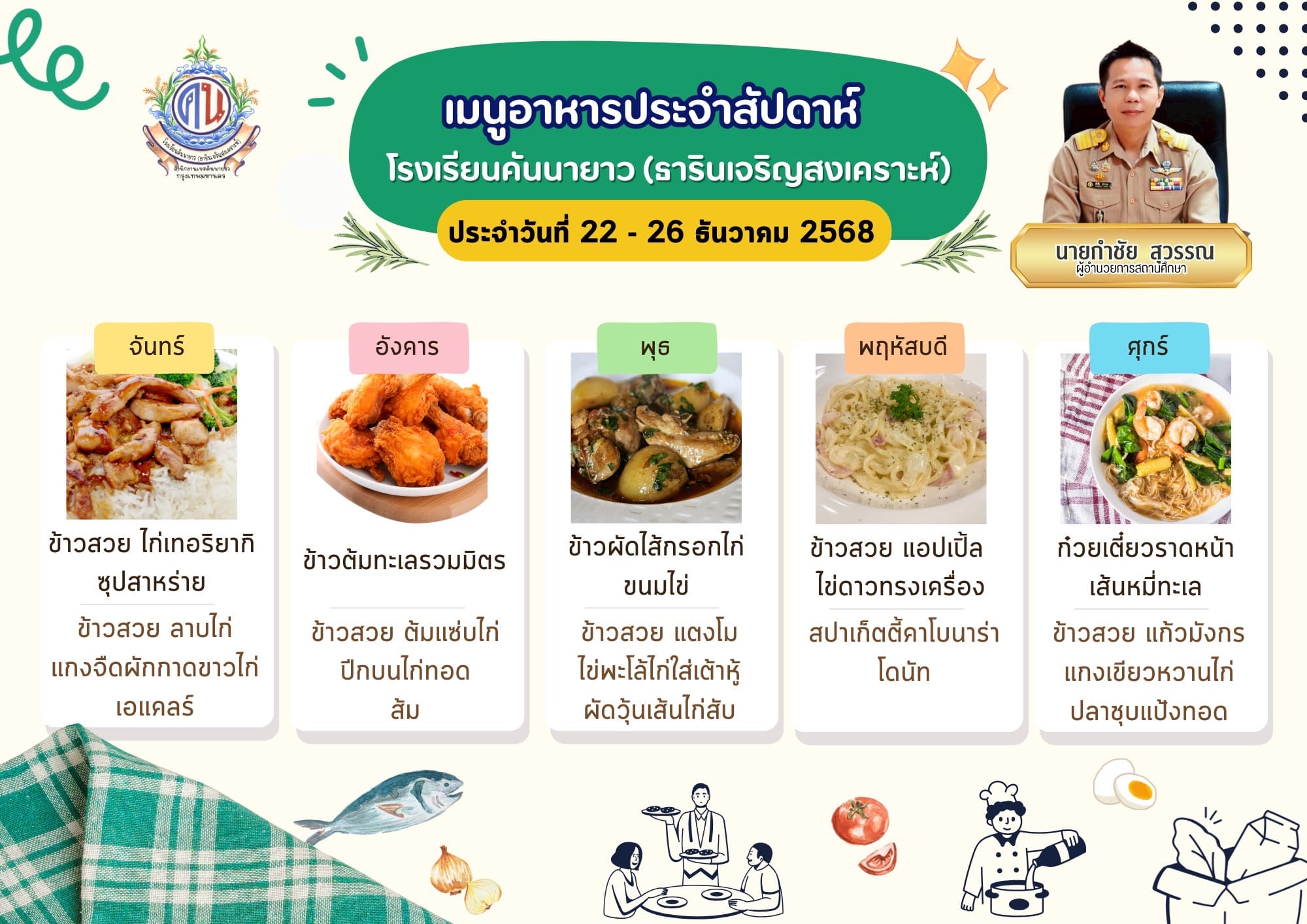 รายการอาหารกลางวัน โรงเรียนคันนายาว(ธารินเจริญสงเคราะห์) วันที่ 22-26 ธันวาคม 2568