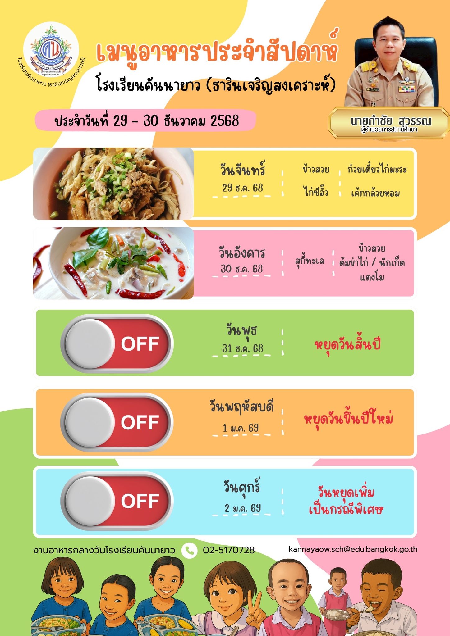 รายการอาหารกลางวัน โรงเรียนคันนายาว(ธารินเจริญสงเคราะห์) วันที่ 29-30 ธันวาคม 2568