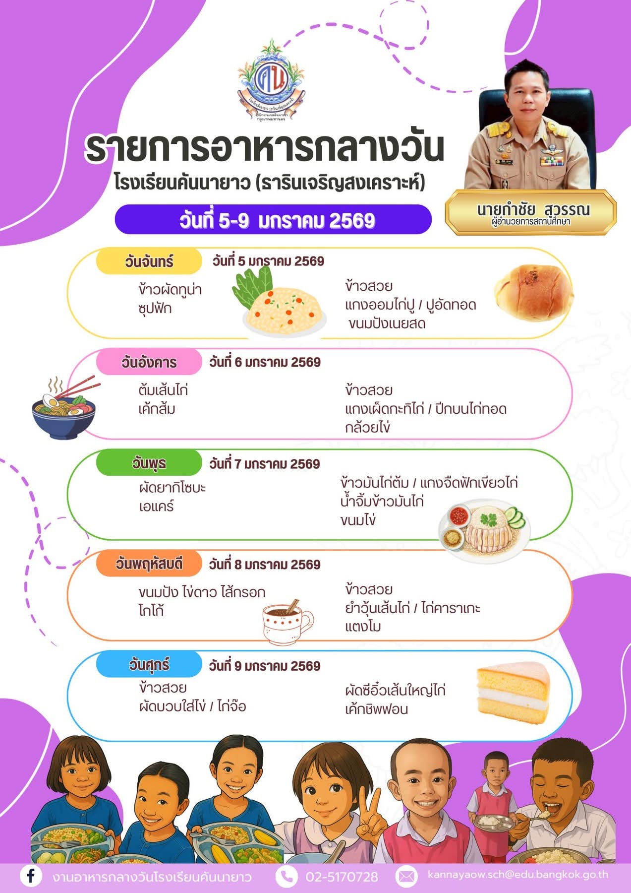 รายการอาหารกลางวัน โรงเรียนคันนายาว(ธารินเจริญสงเคราะห์) วันที่ 5-9 มกราคม 2569