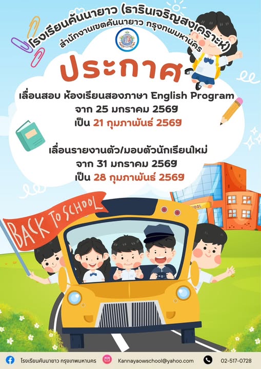 โรงเรียนคันนายาว(ธารินเจริญสงเคราะห์) จึงขอประกาศเลื่อนการสอบคัดเลือกนักเรียนห้องเรียน 2 ภาษา (English Program)และการมอบตัวนักเรียน