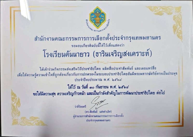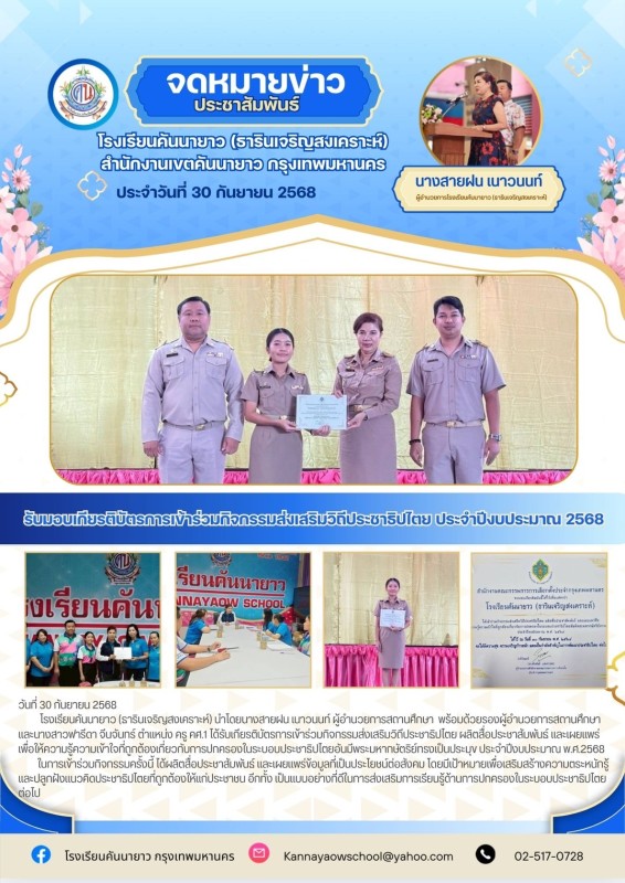 โรงเรียนคันนายาว (ธารินเจริญสงเคราะห์) นำโดยนางสายฝน เนาวนนท์ ผู้อำนวยการสถานศึกษา พร้อมด้วยรองผู้อำนวยการสถานศึกษา และนางสาวฟารีดา จีนจันทร์ ตำแหน่ง ครู คศ.1 ได้รับเกียรติบัตรการเข้าร่วมกิจกรรมส่งเสริมวิถีประชาธิปไตย ผลิตสื่อประชาสัมพันธ์ และเผยแพร่ เพื่อให้ความรู้ความเข้าใจที่ถูกต้องเกี่ยวกับการปกครองในระบอบประชาธิปไตยอันมีพระมหากษัตริย์ทรงเป็นประมุข ประจำปีงบประมาณ พ.ศ.2568
