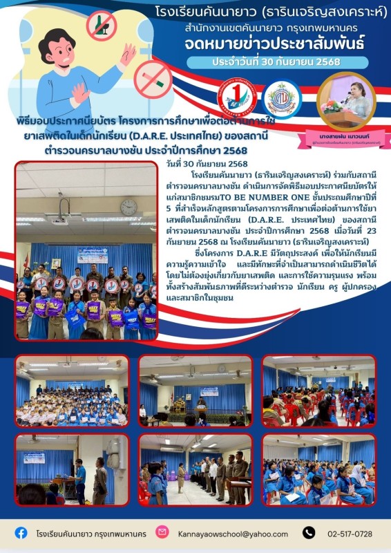 โรงเรียนคันนายาว (ธารินเจริญสงเคราะห์) ร่วมกับสถานีตำรวจนครบาลบางชัน ดำเนินการจัดพิธีมอบประกาศนียบัตรให้แก่สมาชิกชมรมTO BE NUMBER ONE ชั้นประถมศึกษาปีที่ 5 ที่สำเร็จหลักสูตรตามโครงการการศึกษาเพื่อต่อต้านการใช้ยาเสพติดในเด็กนักเรียน (D.A.R.E. ประเทศไทย) ของสถานีตำรวจนครบาลบางชัน ประจำปีการศึกษา 2568 เมื่อวันที่ 23 กันยายน 2568 ณ โรงเรียนคันนายาว (ธารินเจริญสงเคราะห์)