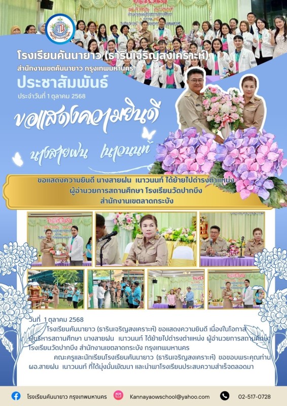 โรงเรียนคันนายาว (ธารินเจริญสงเคราะห์) ขอแสดงความยินดี เนื่องในโอกาสผู้บริหารสถานศึกษา นางสายฝน เนาวนนท์ ได้ย้ายไปดำรงตำแหน่ง ผู้อำนวยการสถานศึกษา โรงเรียนวัดปากบึง สำนักงานเขตลาดกระบัง กรุงเทพมหานคร