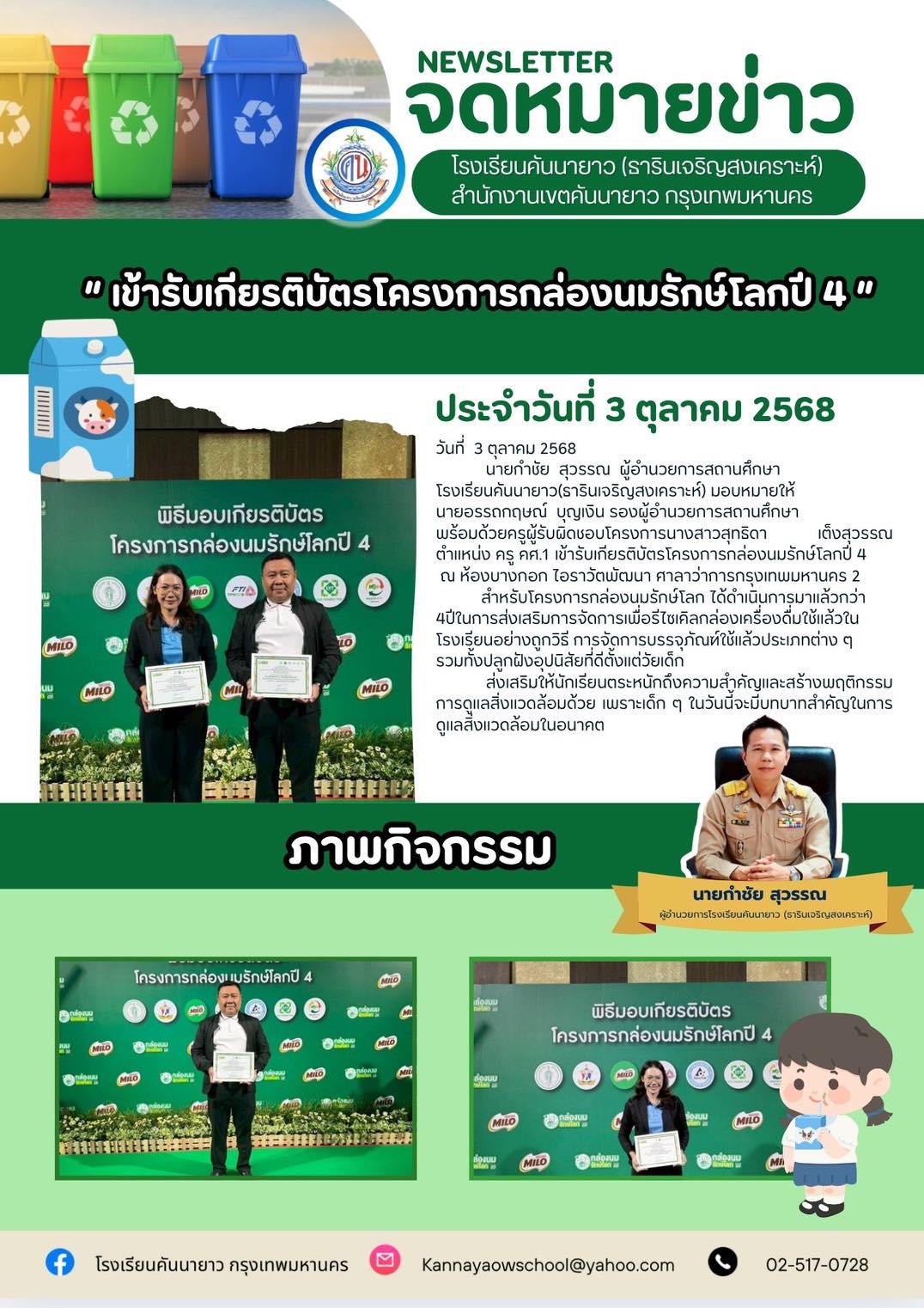 นายกำชัย สุวรรณ ผู้อำนวยการสถานศึกษา โรงเรียนคันนายาว(ธารินเจริญสงเคราะห์) มอบหมายให้นายอรรถกฤษณ์ บุญเงิน รองผู้อำนวยการสถานศึกษา พร้อมด้วยครูผู้รับผิดชอบโครงการ นางสาวสุทธิดา เต็งสุวรรณ ตำแหน่ง ครู คศ.1 เข้ารับเกียรติบัตรโครงการกล่องนมรักษ์โลกปี 4 ณ ห้องบางกอก ไอราวัตพัฒนา ศาลาว่าการกรุงเทพมหานคร 2