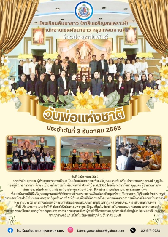 นายกำชัย สุวรรณ ผู้อำนวยการสถานศึกษา โรงเรียนคันนายาว(ธารินเจริญสงเคราะห์) พร้อมด้วยนายอรรถกฤษณ์ บุญเงิน รองผู้อำนวยการสถานศึกษา เข้าร่วมกิจกรรมวันพ่อแห่งชาติ ประจำปี พ.ศ. 2568 โดยมีนางสาวกัลยา บุญแดง ผู้อำนวยการเขตคันนายาว เป็นประธานในพิธี ณ ห้องประชุมเสนีวงศ์ 1 ชั้น 5 สำนักงานเขตคันนายาว กรุงเทพมหานคร