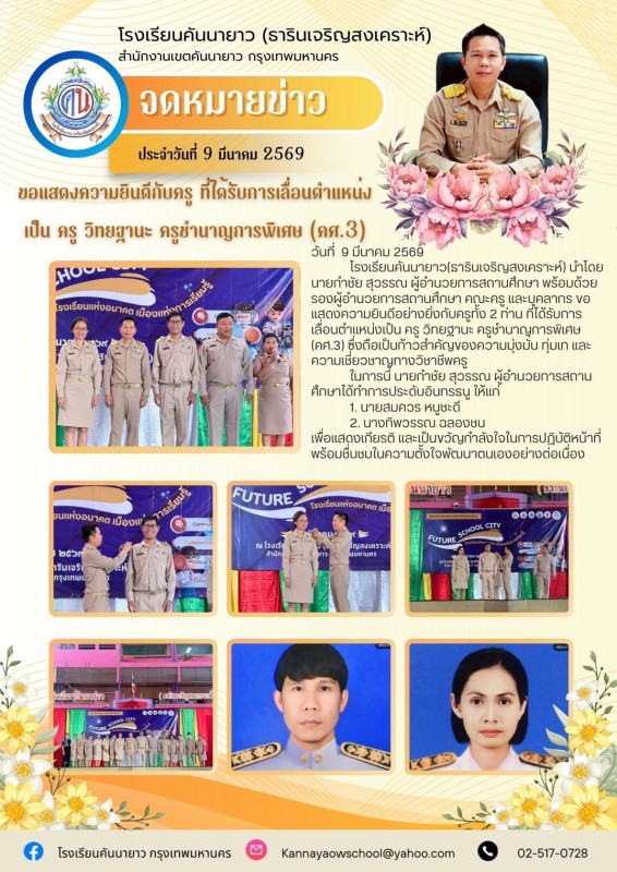โรงเรียนคันนายาว(ธารินเจริญสงเคราะห์) นำโดยนายกำชัย สุวรรณ ผู้อำนวยการสถานศึกษา พร้อมด้วยรองผู้อำนวยการสถานศึกษา คณะครู และบุคลากร ขอแสดงความยินดีอย่างยิ่งกับครูทั้ง 2 ท่าน ที่ได้รับการเลื่อนตำแหน่งเป็น ครู วิทยฐานะ ครูชำนาญการพิเศษ (คศ.3) ซึ่งถือเป็นก้าวสำคัญของความมุ่งมั่น ทุ่มเท และความเชี่ยวชาญทางวิชาชีพครู