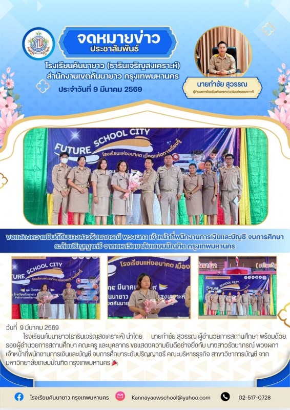 โรงเรียนคันนายาว(ธารินเจริญสงเคราะห์) นำโดย นายกำชัย สุวรรณ ผู้อำนวยการสถานศึกษา พร้อมด้วยรองผู้อำนวยการสถานศึกษา คณะครู และบุคลากร ขอแสดงความยินดีอย่างยิ่งกับ นางสาวรัตนาภรณ์ พวงผกา เจ้าหน้าที่พนักงานการเงินและบัญชี จบการศึกษาระดับปริญญาตรี คณะบริหารธุรกิจ สาขาวิชาการบัญชี จากมหาวิทยาลัยเกษมบัณฑิต กรุงเทพมหานคร